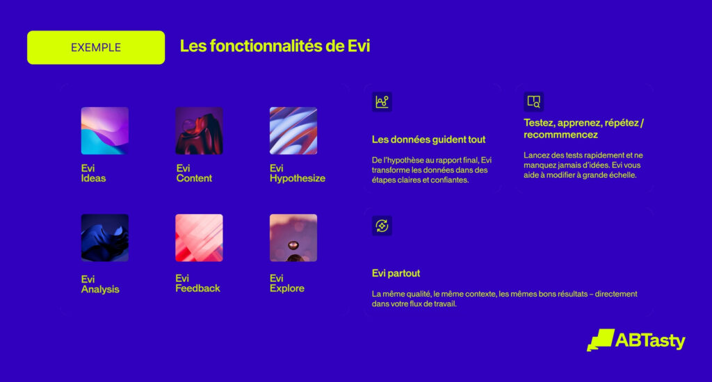 - Intelligence propriétaire : Evi est exclusivement entraînée sur les données propriétaires d’AB Tasty. Cela garantit qu’elle fournit des résultats pertinents et prêts à être testés.